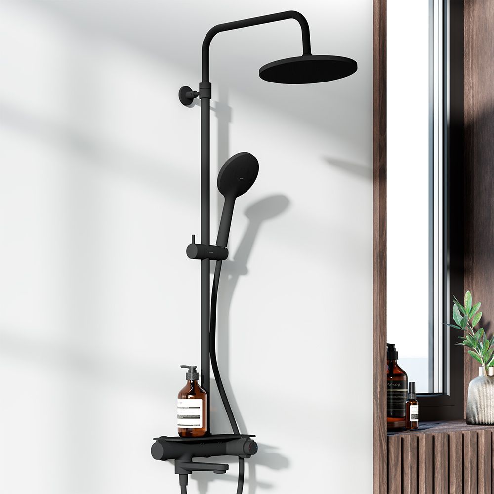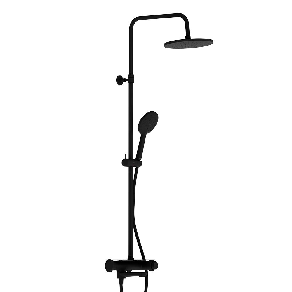 Стильный и лаконичный дизайн душевой системы Jupiter в матовом черном исполнении прекрасно подойдет как для классической так и для современной ванной комнаты. Максимальная безопасность: термостатический картридж 35 мм обеспечивает точную настройку температуры и напора воды. Непревзойдённый комфорт и удобство: смеситель выполнен в виде компактной полочки где вы можете хранить все необходимые вещи.