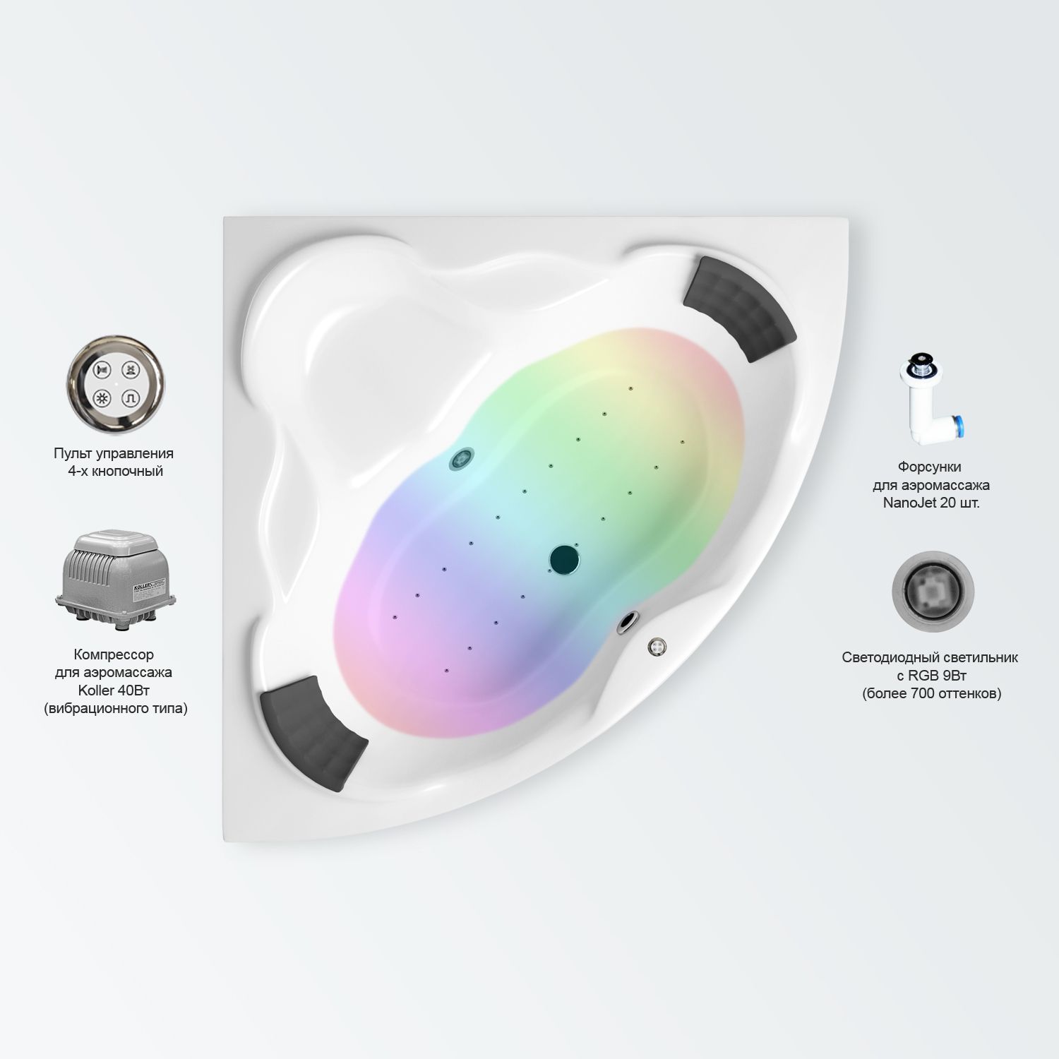 Аэромассажная система выполняет общий массаж тела при помощи сжатого воздуха через маленькие форсунки (нанофорсунки). Форсунки имеют плоскую конструкцию (без выпирающих частей), что не создает дискомфорт, как при принятии ванны, так и во время массажа.