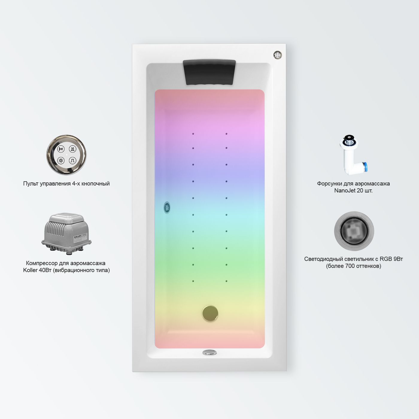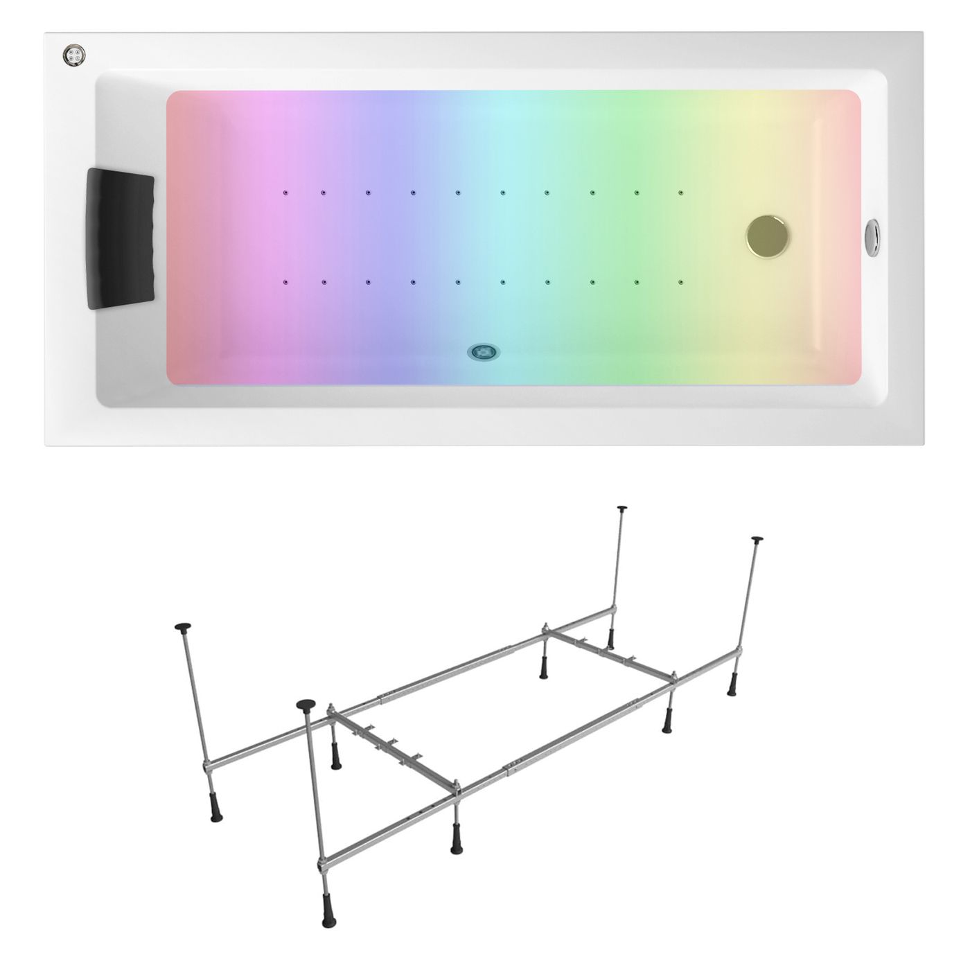 Дополнительно ванна может быть доукомплектована ультра плоскими лицевыми и торцевыми экранами, гидро-, аэро-массажными системами, хромотерапией.