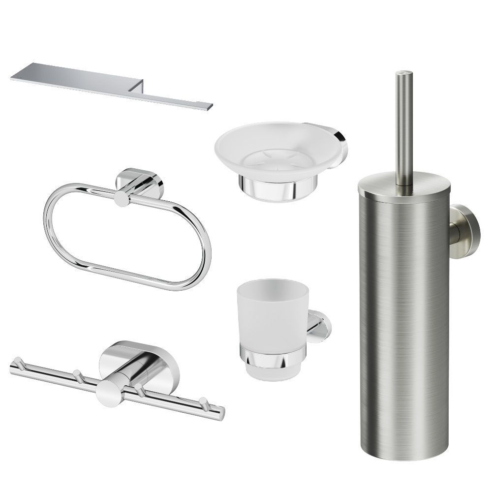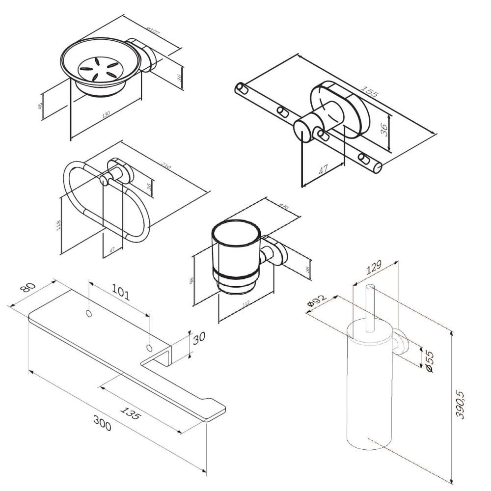 Занимая минимум места в пространстве аксессуары Sense L помогут рационально организовать место для хранения и станут стильными акцентами в интерьере. В комплекте: стеклянная мыльница стеклянный стакан набор крючков для полотенец кольцо для полотенец держатель для туалетной бумаги с полкой стойка с туалетной щеткой.