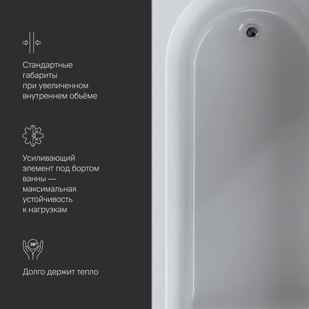 Сохраняя стандартные габариты ванна имеет увеличенный внутренний объём комфортный для человека любой комплектации.