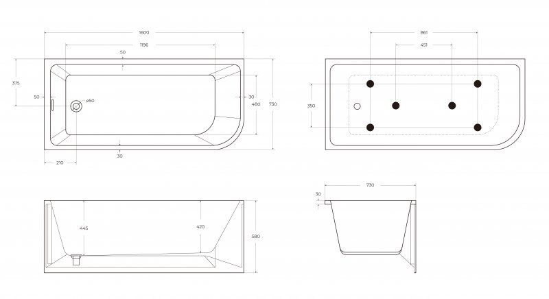 Ванны без декоративной накладки на переливное отверстие, донный клапан в цвете хром или белый матовый. Перед заказом уточняйте необходимую комплектацию в отделе продаж.