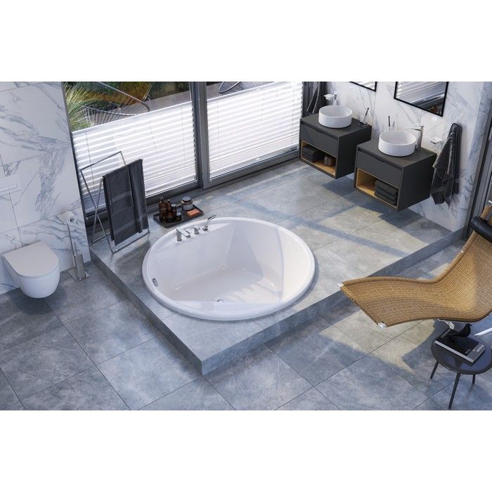 Огромная круглая ванна, практически домашний бассейн из литого акрила чистого белого цвета. Дно ванны усилено ДСП-плитой. Удобные полочки по бокам позволяют установить набортный смеситель или разместить средста для ухода.