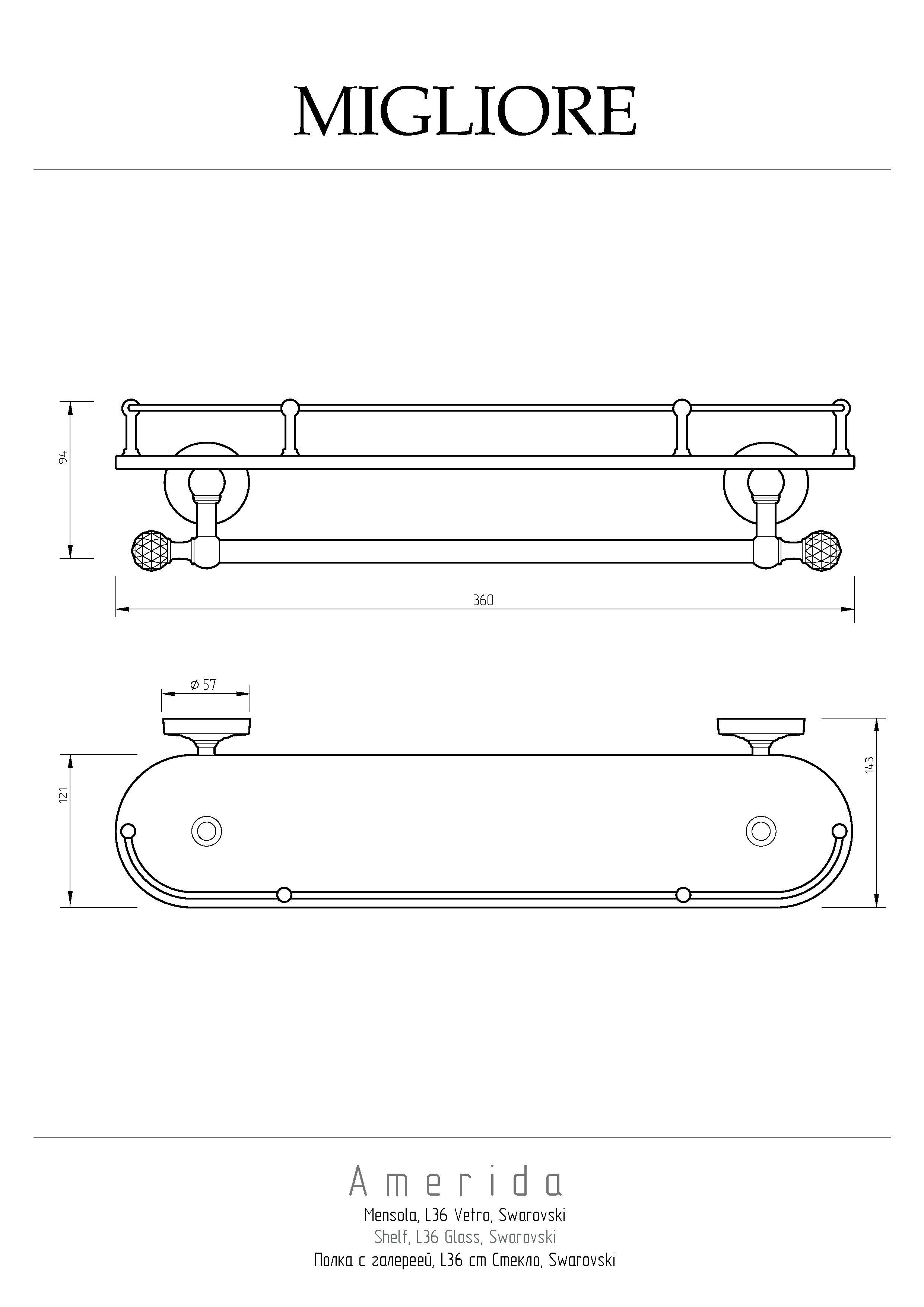 Полка с галереей коллекции AMERIDA бренда MIGLIORE - незаменимый аксессуар для ванной комнаты в классическом стиле. На ней вы сможете разместить все необходимые косметические средства, которые будут всегда у вас под рукой. Ограничитель по переднему краю полки не позволит упасть тюбикам и предметам. Аксессуар украшен кристаллами Сваровски.