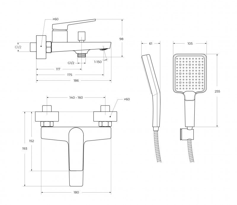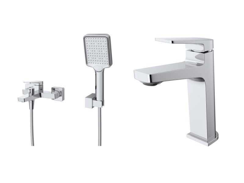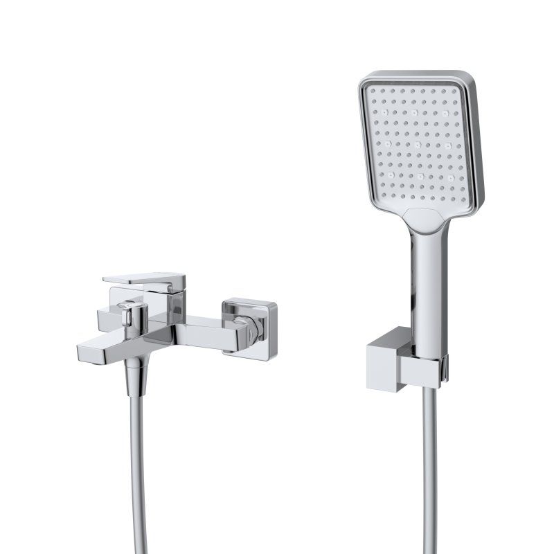 Оснащение: душевой шланг ПВХ, ручной душ, настенный держатель ручного душа, смеситель