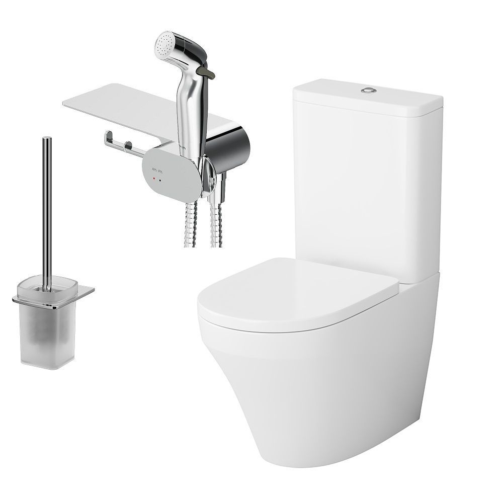 Полностью готовый к установке комплект: напольный унитаз компакт сиденье для унитаза микролифт гигиенический набор с полкой cтойка с туалетной щеткой.