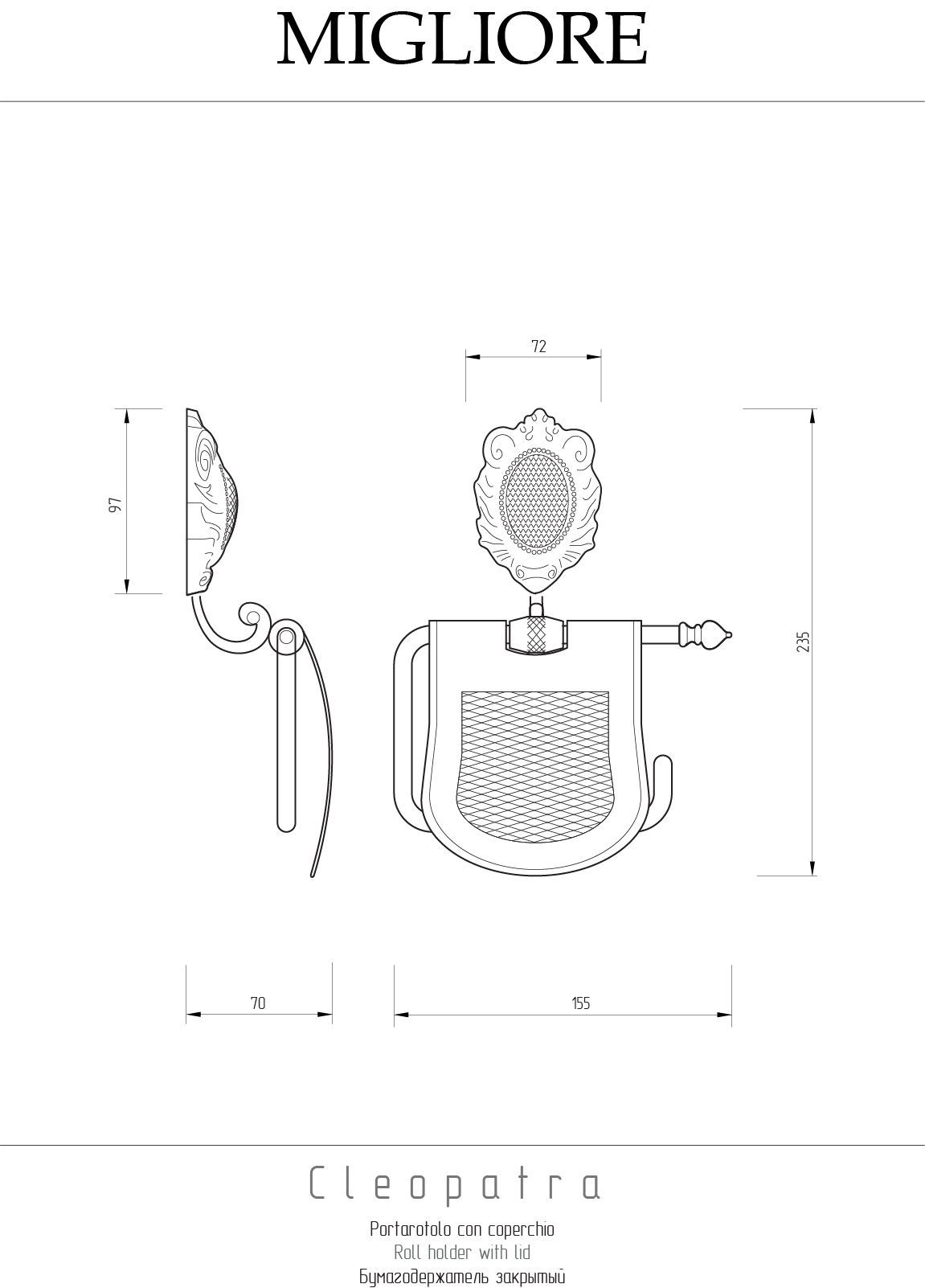Бумагодержатель закрытый коллекции CLEOPATRA бренда MIGLIORE — это один из необходимых аксессуаров для ванной комнаты. Бумагодержатель с крышкой смотрится эстетично, и крышка защищает бумагу от попадания брызг и пыли. Розетка аксессуара имеет необычную форму, и удобный крепеж.