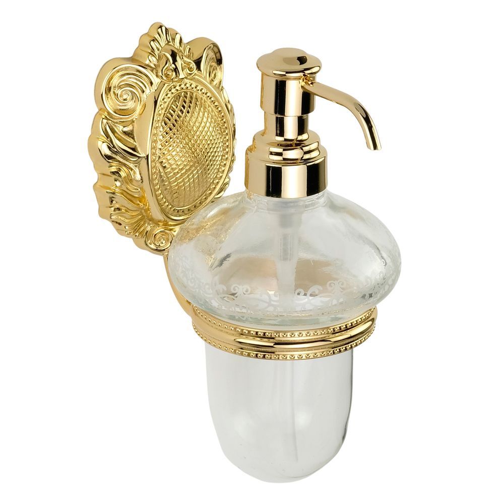 Дозатор жидкого мыла настенный с керамической колбой коллекции CLEOPATRA бренда MIGLIORE - один из необходимых аксессуаров, который можно использовать в ванной комнате и на кухне для мыла или моющего средства. Высококачественное стекло легко моется, а нажимной механизм имеет эргономичный дизайн. Между стеклом и латунным кольцом имеется уплотнительное пластиковое кольцо, которое надежно удерживает колбу дозатора. Розетка аксессуара имеет необычную форму, и удобный крепеж.