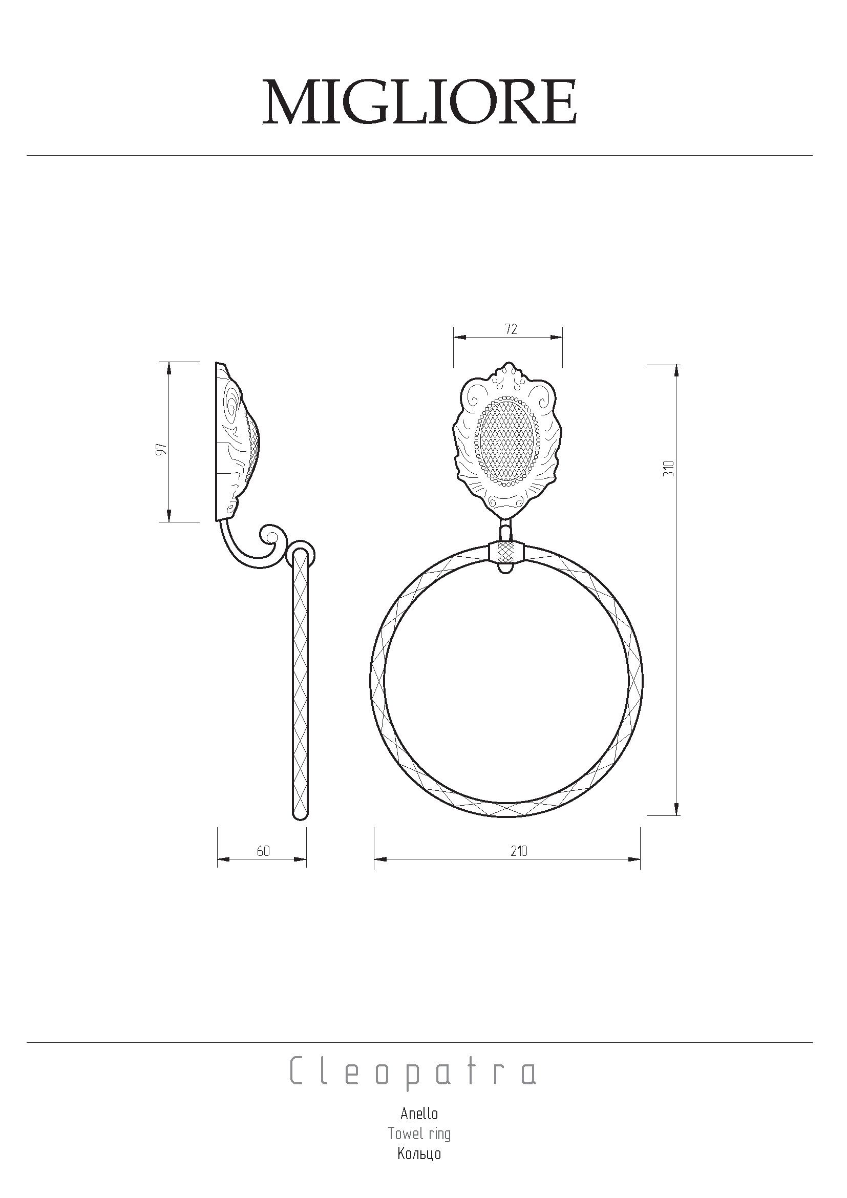 Настенное кольцо коллекции CLEOPATRA бренда MIGLIORE предназначено для полотенец небольшого размера для рук и лица. Данное кольцо можно использовать также на кухне для кухонных полотенец. Розетка аксессуара имеет необычную форму, и удобный крепеж.
