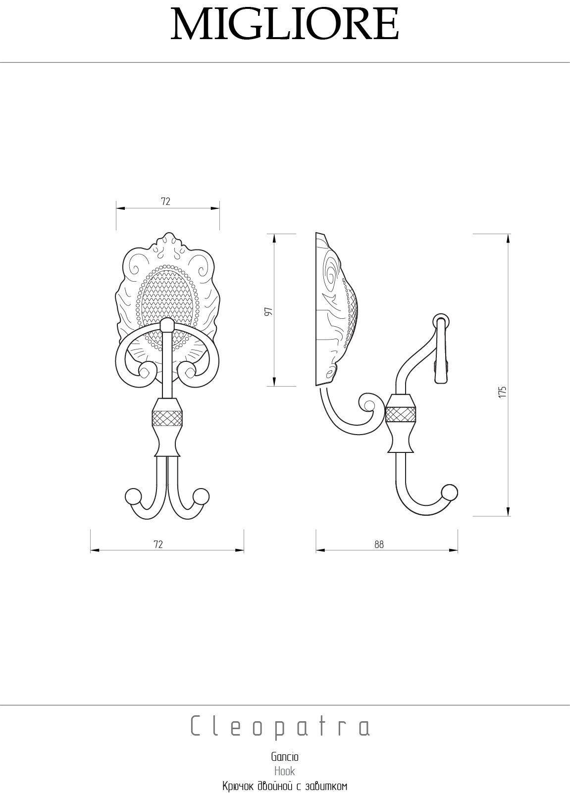Двойной крючок с завитком коллекции CLEOPATRA бренда MIGLIORE - это незаменимый аксессуар для ванной комнаты в роскошном стиле. Вы можете использовать данный крючок также и в интерьере кухни или других комнат. Розетка аксессуара имеет необычную форму, и удобный крепеж.