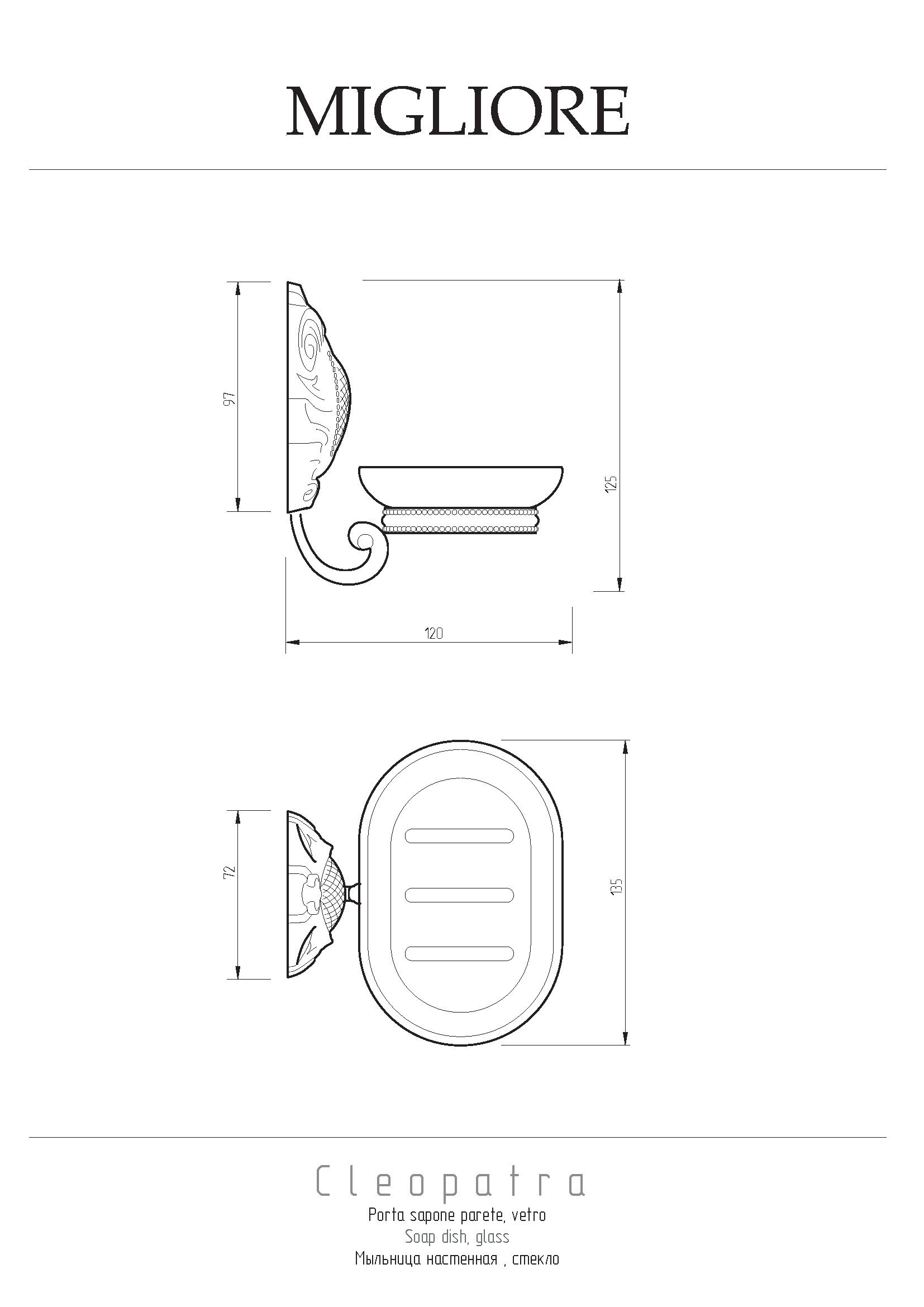 Мыльница настенная коллекции CLEOPATRA бренда MIGLIORE - один из необходимых аксессуаров для ванной комнаты. Качественная стекло, которое очень легко мыть. Между стеклом и латунным кольцом имеется уплотнительное пластиковое кольцо, которое надежно удерживает мыльницу. Розетка аксессуара имеет необычную форму, и удобный крепеж.