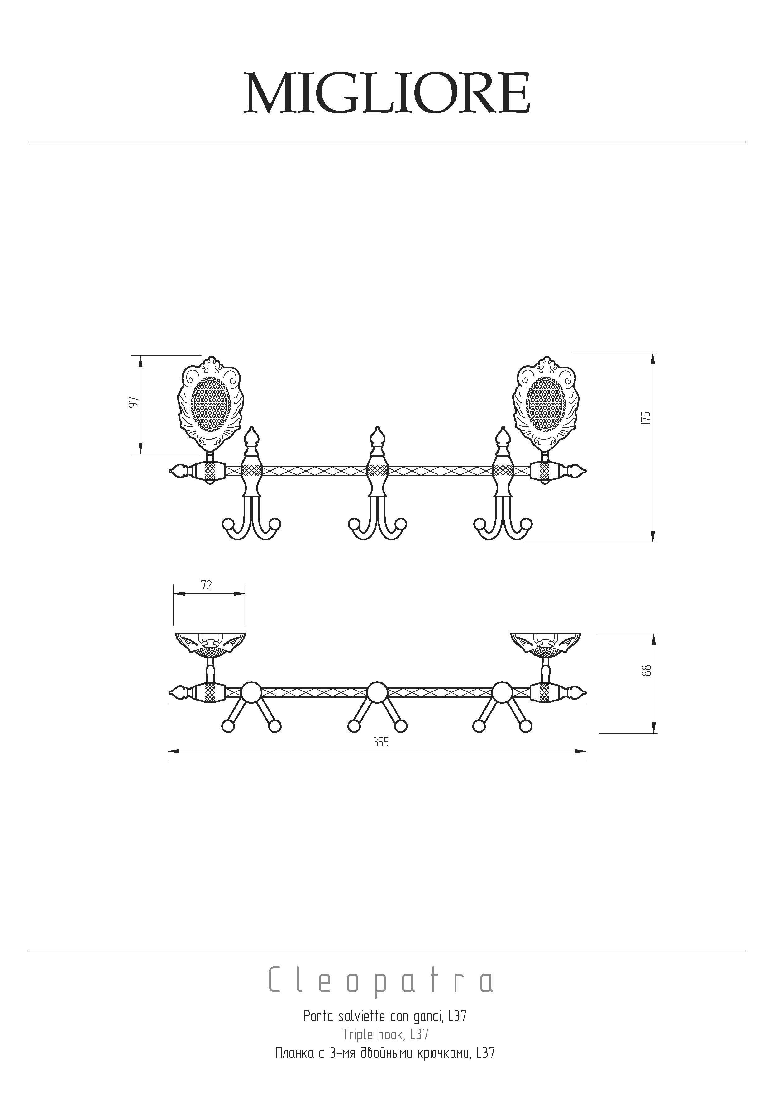 Планка с 3-мя крючками коллекции CLEOPATRA бренда MIGLIORE- многофункциональный аксессуар, который можно использовать в ванной комнате, в сауне, в коридоре или на кухне. 3 крючка классической формы расположены на достаточном удалении друг от друга, что позволит удобно разместить любые вещи и полотенца.