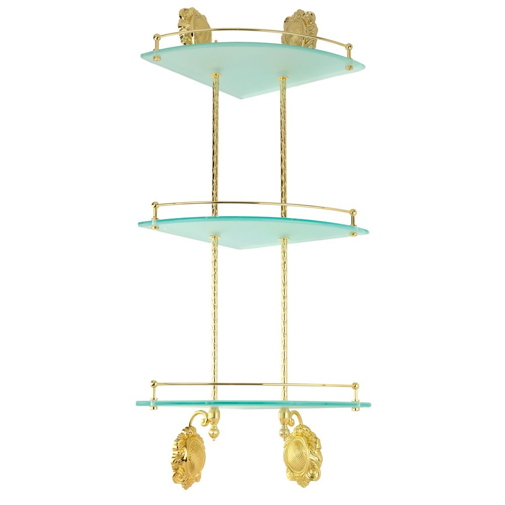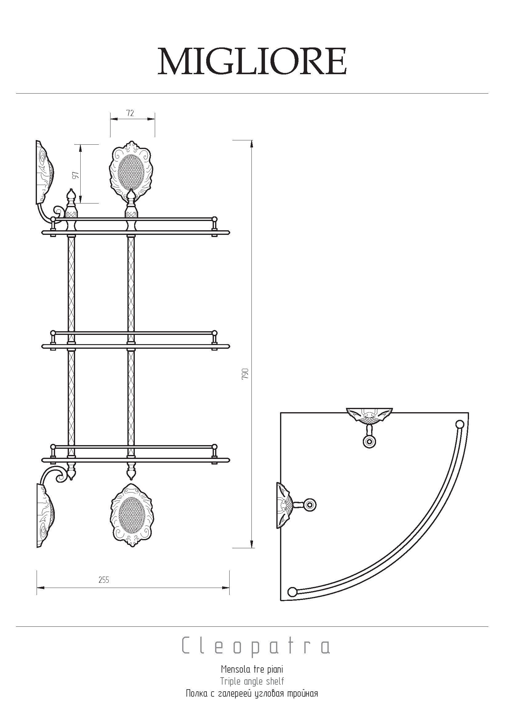 Полка с галереей угловая тройная коллекции CLEOPATRA бренда MIGLIORE — это функциональный аксессуар для ванной комнаты в классическом стиле. На ней можно разместить все необходимые косметические средства, которые будут всегда у вас под рукой. Ограничительпо переднему краю полки не позволит упасть тюбикам и предметам. Стекло легко чистится тряпочкой и/или средством для чистки стекол.