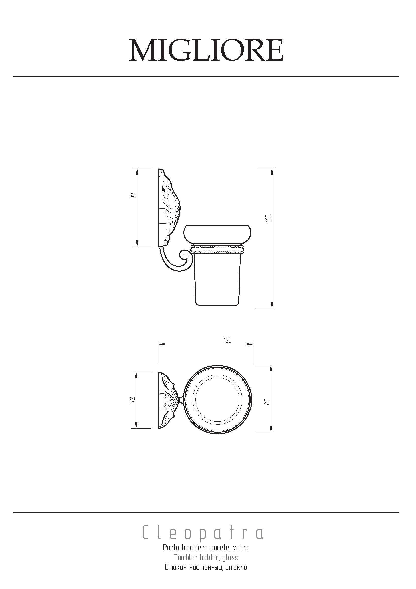 Стакан настенный коллекции CLEOPATRA бренда MIGLIORE — один из самых необходимых аксессуаров для ванной комнаты. Стакан выполнен в классическом стиле и предназначен для хранения зубных щеток и тюбиков с пастой. Между стеклом и латунным кольцом имеется уплотнительное пластиковое кольцо, которое надежно удерживает колбу стакана. Розетка аксессуара имеет необычную форму, и удобный крепеж.