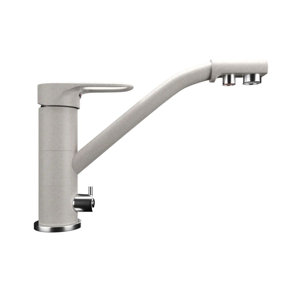 ULGRAN Quartz UQ-010 - высокоэргономичный кухонный смеситель с дополнительным краном для подключения фильтрованной воды, оснащенный кран-буксой с керамическими пластинами. Реализован тройной подвод воды через один излив: холодная, горячая и фильтрованная. Переход с одного подвода на другой производится поворотом рычага. Набор для соединения с фильтром входит в комплект . Система фильтрации приобретается дополнительно и монтируется под мойку, специальный индикатор сообщает о необходимости замены картриджа. Материал корпуса выполнен из высококачественной латуни, а окрашивание под "искусственный камень" в цвет мойки ULGRAN Quartz выполняется на собственном производстве, что позволяет идеально попасть в фирменный цвет ULGRAN Quart. В качестве керамического картриджа используется известный бренд Wanhai диаметром 35 мм с высокой пропускной способностью в 500 тысяч циклов "открывания-закрывания". На подвижные части картриджа Wanhai нанесена специальная невымываемая силиконовая смазка, а керамические пластины изготовлены из 96% оксида алюминия, что, в сочетании с высоким качеством шлифовки обеспечивает долговечность, надежность, плавность хода рукоятки. Смеситель оборудован съемным пластиковым аэратором для экономии воды и поворотным изливом на 360 градусов. В комплектацию входя: керамический картридж Wanhai, гибкая подводка, комплект крепежных элементов, кран-букса с керамическими пластинами для дополнительного излива для фильтрованной воды, набор для подсоединения фильтра питьевой воды (гибкая подводка + переходник-цанга), технический паспорт и гарантийный талон. Заводская гарантия составляет 3 года на материал корпуса, 1 год на комплектующие к смесителю и 1 год на материал покрытия.
