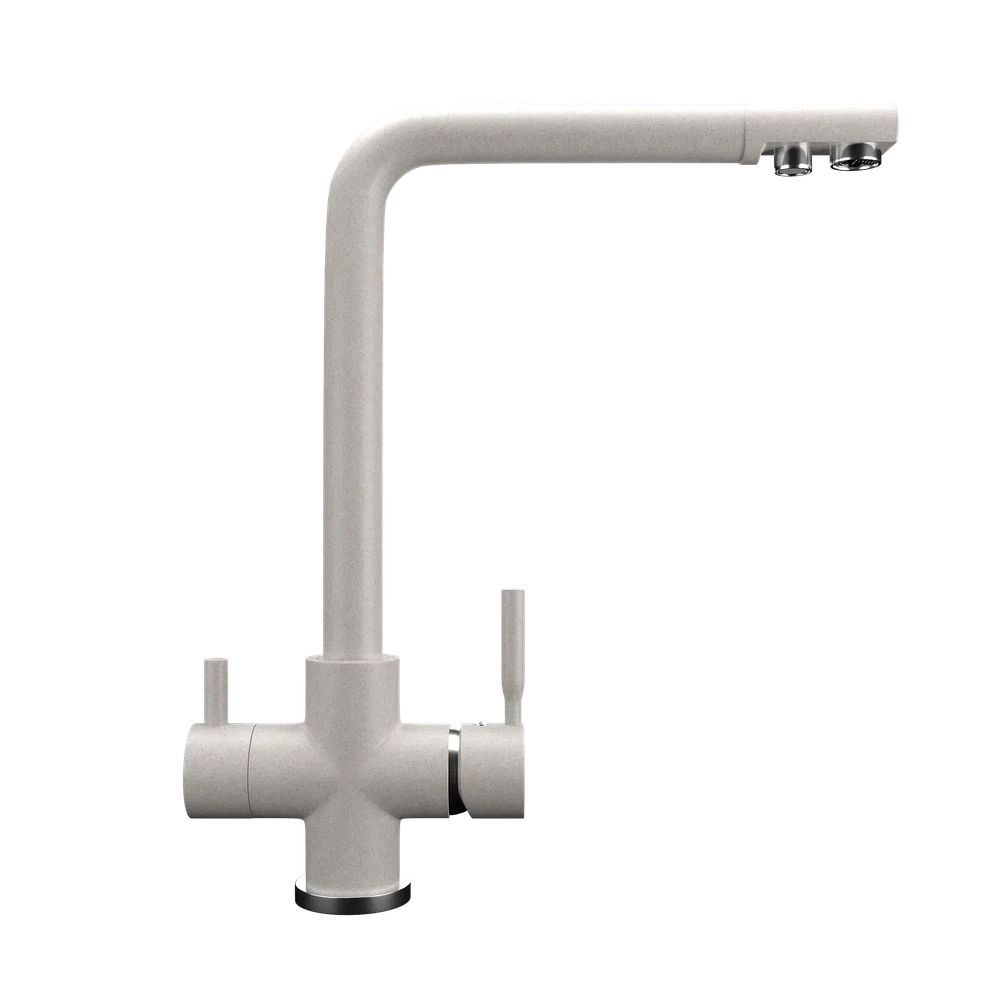 ULGRAN Quartz UQ-016 - высокоэргономичный кухонный смеситель с дополнительным краном для подключения фильтрованной воды, оснащенный кран-буксой с керамическими пластинами. Реализован тройной подвод воды через один излив: холодная, горячая и фильтрованная. Переход с одного подвода на другой производится поворотом рычага. Набор для соединения с фильтром входит в комплект . Система фильтрации приобретается дополнительно и монтируется под мойку, специальный индикатор сообщает о необходимости замены картриджа. Материал корпуса выполнен из высококачественной латуни, а окрашивание под "искусственный камень" в цвет мойки ULGRAN Quart выполняется на собственном производстве, что позволяет идеально попасть в фирменный цвет ULGRAN Quart. В качестве керамического картриджа используется известный бренд Wanhai диаметром 35 мм с высокой пропускной способностью в 500 тысяч циклов "открывания-закрывания". На подвижные части картриджа Wanhai нанесена специальная невымываемая силиконовая смазка, а керамические пластины изготовлены из 96% оксида алюминия, что, в сочетании с высоким качеством шлифовки обеспечивает долговечность, надежность, плавность хода рукоятки. Смеситель оборудован съемным пластиковым аэратором для экономии воды и поворотным изливом на 360 градусов. В комплектацию входят: керамический картридж Wanhai, гибкая подводка, комплект крепежных элементов, кран-букса с керамическими пластинами для дополнительного излива для фильтрованной воды, набор для подсоединения фильтра питьевой воды (гибкая подводка + переходник-цанга), технический паспорт и гарантийный талон. Заводская гарантия составляет 3 года на материал корпуса, 1 год на комплектующие к смесителю и 1 год на материал покрытия.