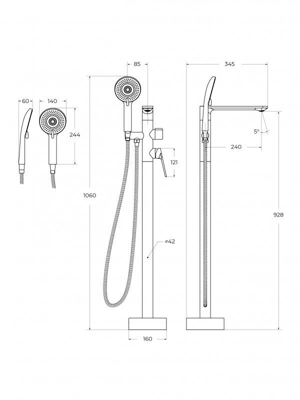 Оснащение: душевой шланг ПВХ длиной 150 см, ручной душ 3-х режимный, аэратор, держатель для душевой лейки, дивертор
