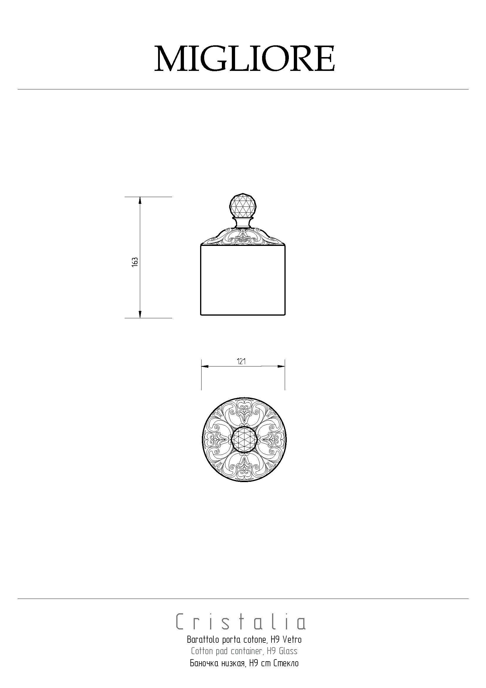 Баночка настольная серии CRISTALIA бренда MIGLIORE предназначена для хранения ватных дисков, но в ней также можно любые различные предметы, и использовать ее не только в ванной комнате. Стекло баночки изготовлено вручную с добавлением фольги из золота, которая, растворяясь в стекле, образует богатый и красивый декор. Аксессуар украшен кристаллом Сваровски.