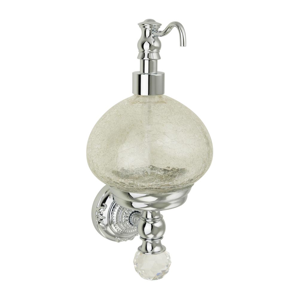 Дозатор настенный коллекции CRISTALIA бренда MIGLIORE -один из самых необходимых аксессуаров для ванной комнаты. Стекло дозатора изготовлено вручную с добавлением фольги из серебра, которая, растворяясь в стекле, образует богатый и красивый декор. Аксессуар украшен кристаллом Сваровски. При необходимости дозатор можно вынуть из посадочного места, чтобы помыть