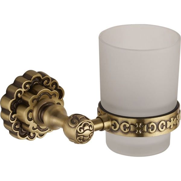 Стакан из матового стекла с держателем из качественного латунного сплава. Тщательное патинирование придает изделию великолепный блеск и цвет. Крепление к стене шурупами.