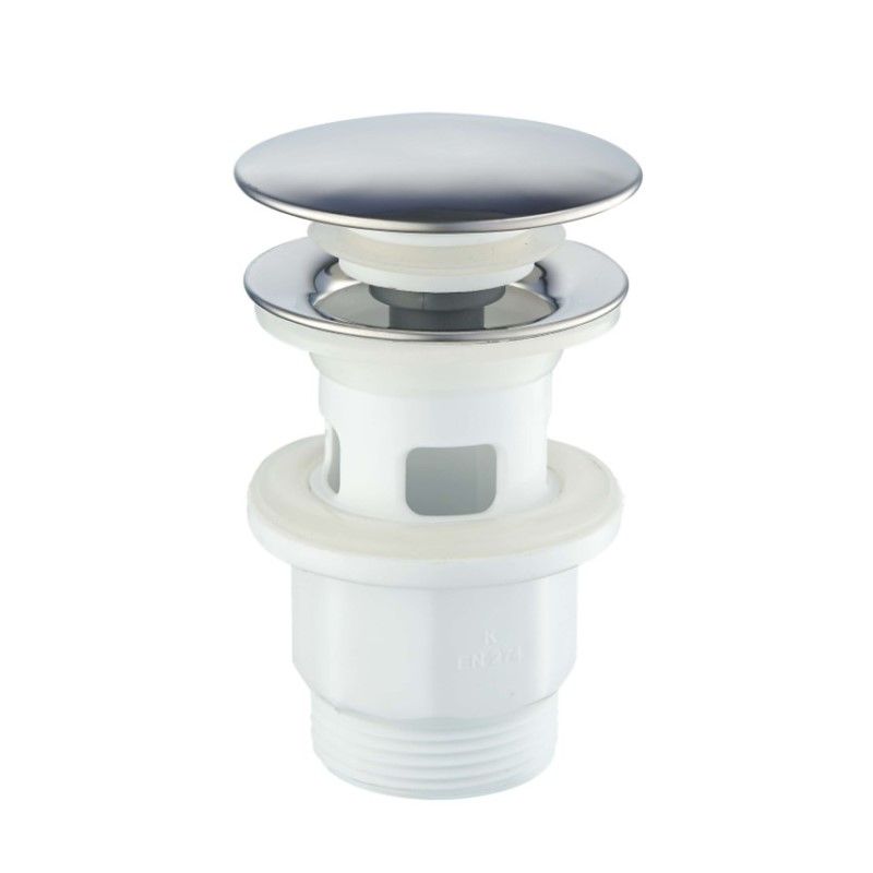 Донный клапан Haiba HB65-4. Данная модель имеет пластиковый корпус белого цвета. Крышка хромированная, выполнена из нержавеющей стали. Силиконовые прокладки обеспечивают плотное прилегание донного клапана к посадочному месту раковины. Имеет перелив.