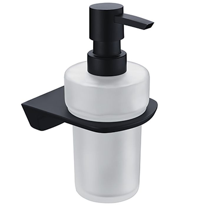 Дозатор изготовлен из закаленного матового стекла. Материал держателя - металл с черным покрытием.