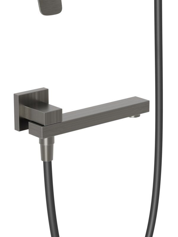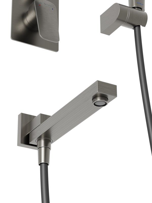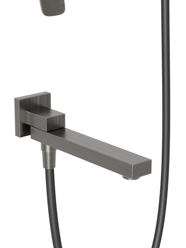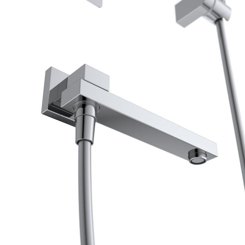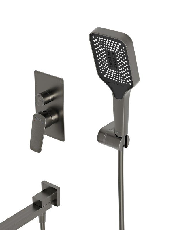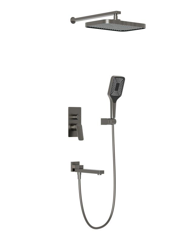 Оснащение: встраиваемый смеситель с переключателем на два выхода, верхний душ с кронштейном, излив для ванны, ручной душ 3-х режимный со шлангом, штуцером и держателем