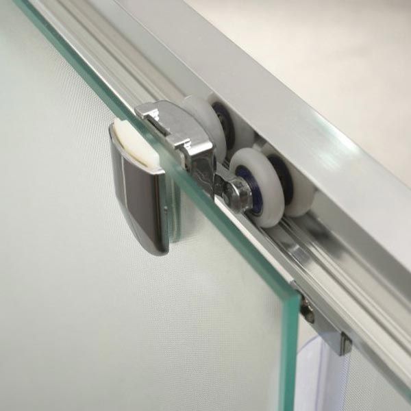 Раздвижная душевая дверь Бельбаньо Уно имеет одну раздвижную створку, профиль выполнен из анодированного алюминия, стандарт DIN17611 2007, цвет хром. Полотно двери выполнено из рифленого закаленного стекла толщиной 5 мм и крепится на двойные подшипниковые ролики. Ручка выполнена из нержавеющей стали.