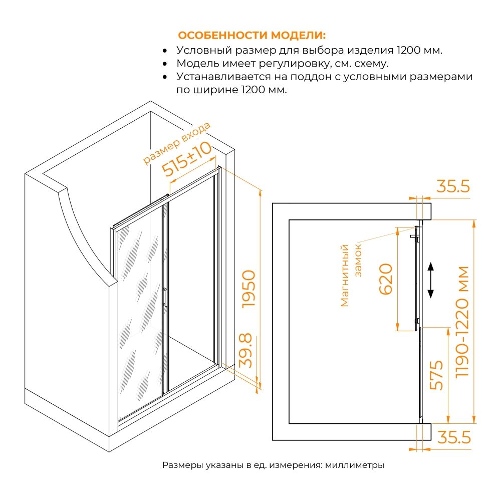Душевая перегородка для ниши с раздвижной дверью, образует прямоугольную душевую зону. Ограждающая водяной поток, стеклянная дверь в душ, состоит из одного – стационарного полотна и второго полотна - «Дверь», установленного на ролики. При работе полотно плавно сдвигается вдоль душевой зоны, параллельно стационарного стеклянного полотна, образуя тем самым систему «Дверь - Купе».