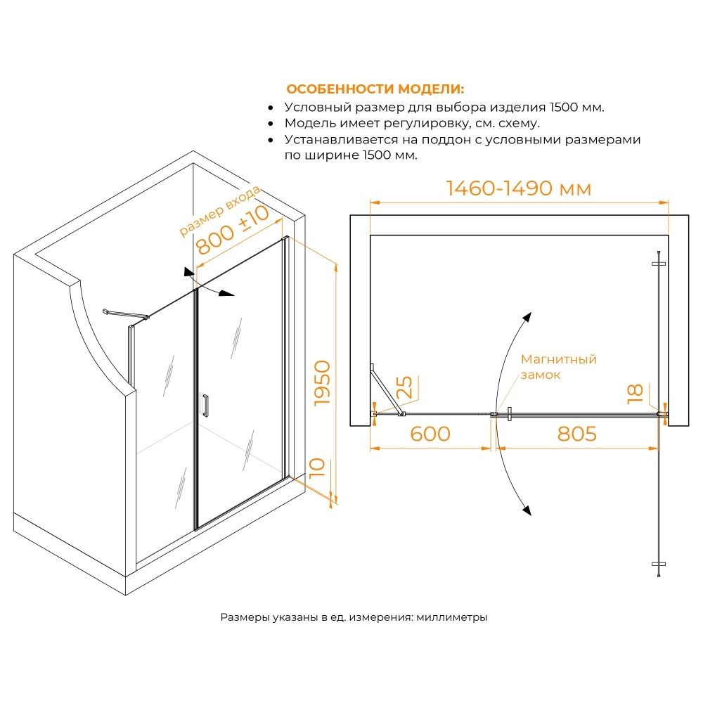 Душевая дверь изготовлена из стекла толщиной 6 мм, обеспечивающего превосходную прочность и долговечность. Прозрачный цвет стекла создает современный и открытый вид, а хромированный цвет профиля добавляет нотку элегантности. Общая высота двери составляет 1950 мм, что делает ее подходящей для большинства стандартных душевых кабин.