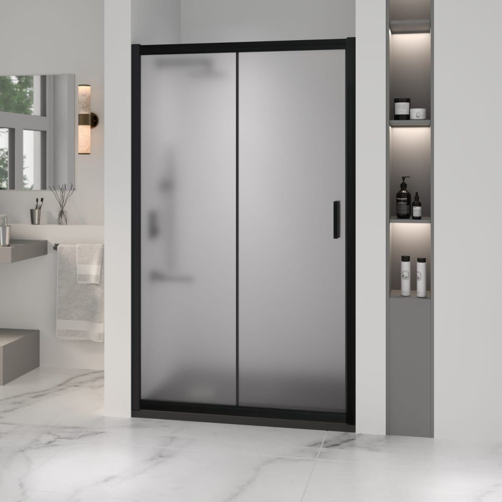 Профиль двери выполнен из анодированного алюминия черного цвета, что придает ей элегантный и современный вид. Высота общая двери составляет 1950 миллиметров. Конструкция дверей раздвижная, что позволяет сэкономить место в ванной комнате.