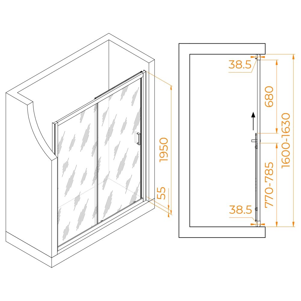 Профиль двери выполнен из анодированного алюминия черного цвета, что придает ей элегантный и современный вид. Высота общая двери составляет 1950 миллиметров. Конструкция дверей раздвижная, что позволяет сэкономить место в ванной комнате.