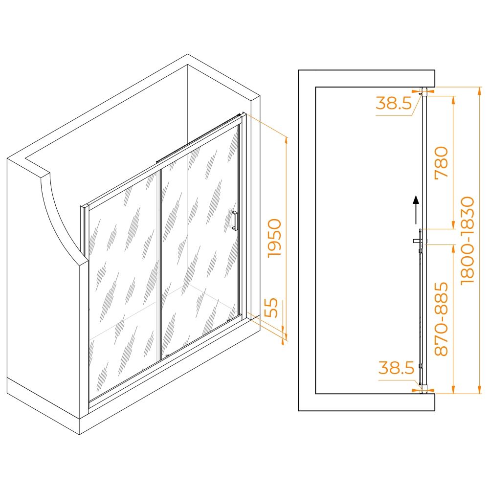 Профиль двери выполнен из анодированного алюминия черного цвета, что придает ей элегантный и современный вид. Высота общая двери составляет 1950 миллиметров. Конструкция дверей раздвижная, что позволяет сэкономить место в ванной комнате.
