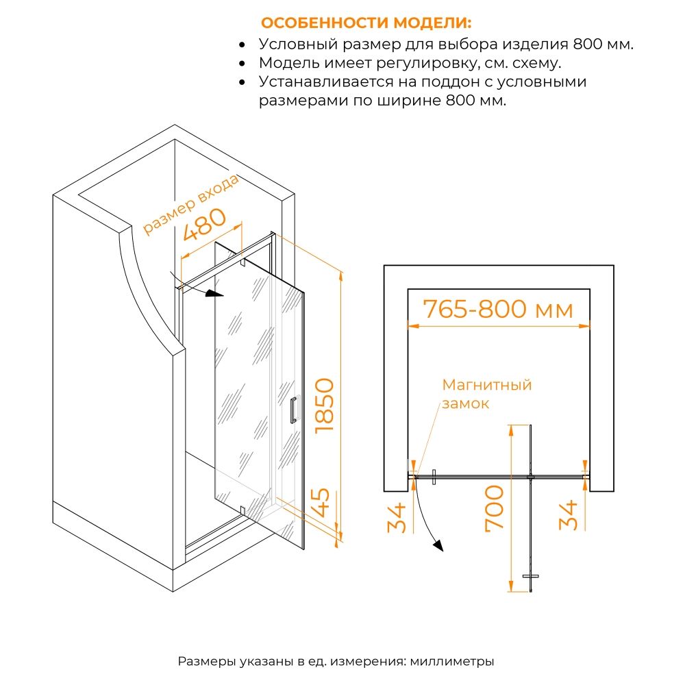 Водонепроницаемые стальные петли гарантируют, что вода останется внутри душа, предотвращая любые утечки или повреждение водой пола вашей ванной комнаты. Общая высота душевой двери составляет 1850 мм, что обеспечивает достаточно места даже для самых высоких людей.
