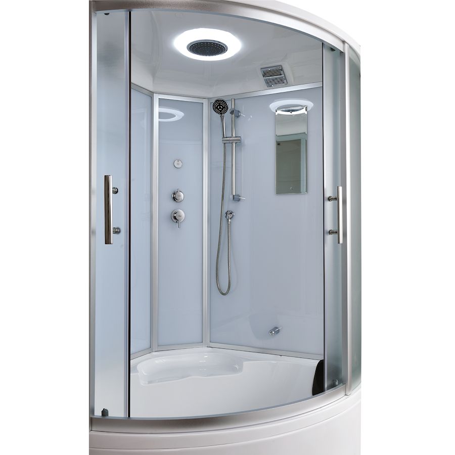 душевая кабина, стеклянная полочка, подсветка верхняя, однорычажный трехрехрежимный смеситель, верхний душ, ручная лейка на регулируемой по высоте штанге, излив, подголовник |