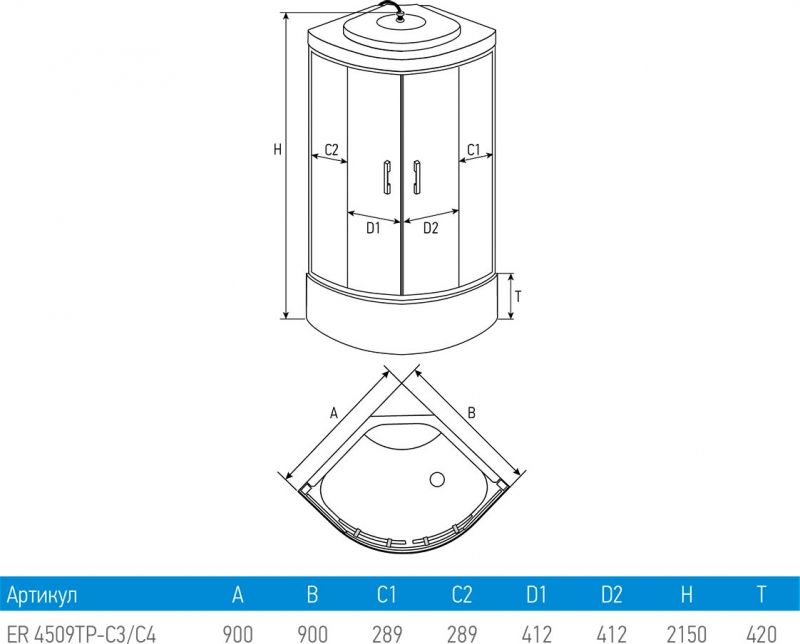 Функциональная душевая кабина Erlit Comfort имеет форму четверть круга. Для комфортного использования внутри кабины зеркало, радио, вентиляция и полочка.