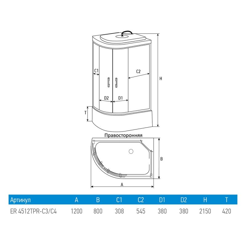 Душевая кабина Erlit ER4512TPR-C3 с гидромассажем, поддоном высотой 42 см и крышей.