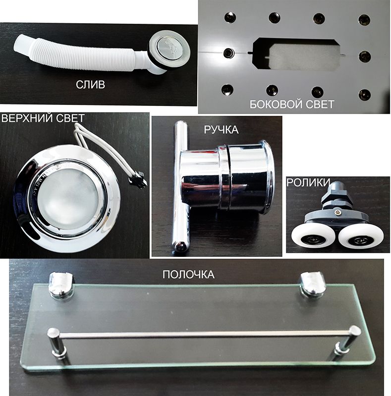 - Поддон: литой, акриловый, на каркасе, с сифоном с гофрой.