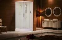 Низкий поддон. Сифон с гидрозатвором. Стекло: 5 мм, переднее - "матовое". заднее - "белое крашеное". Комплектующие: большое овальное зеркало с фацетом, полочка со стаканчиком, смеситель, 3-х режимная душевая лейка на стойке, мыльница, двойные ролики. Модель "СR" - угловая кабина со стеклянной крышей, верхним душем с прорезиненными соплами и вентиляционным отверстием.ПРОЗРАЧНОЕ переднее стекло. "Easy clean glass". БЕЛЫЙ профиль.