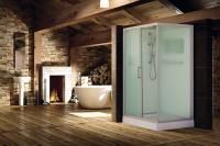 Низкий поддон. Сифон с гидрозатвором. Стекло: 5 мм, переднее - "матовое". заднее - "белое крашеное". Комплектующие: большое овальное зеркало с фацетом, полочка со стаканчиком, смеситель, 3-х режимная душевая лейка на стойке, мыльница, двойные ролики. Модель "СКR" - квадратная кабина со стеклянной крышей, верхним душем с прорезиненными соплами и вентиляционным отверстием.