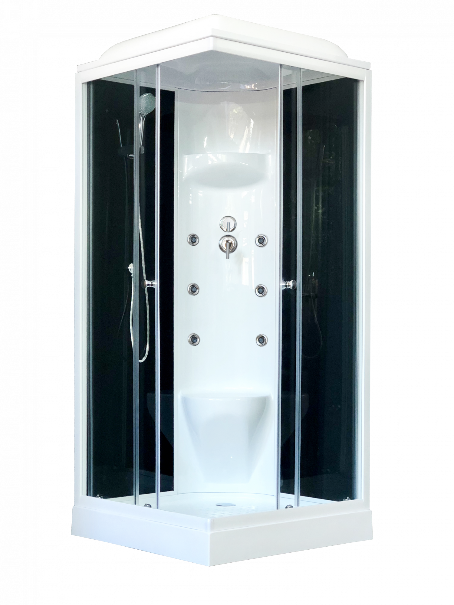 Квадратная душевая кабина оснащена двумя раздвижными дверцами. Превосходно будет сочетаться в интерьере любой стилистической направленности за счет изысканных форм и плавных линий. Внутри кабины имеется встроенное сидение, что добавит комфорта в повседневном использовании душевой кабины. Имеется крыша, поддон выполнен из прочного и приятного на ощупь акрила.