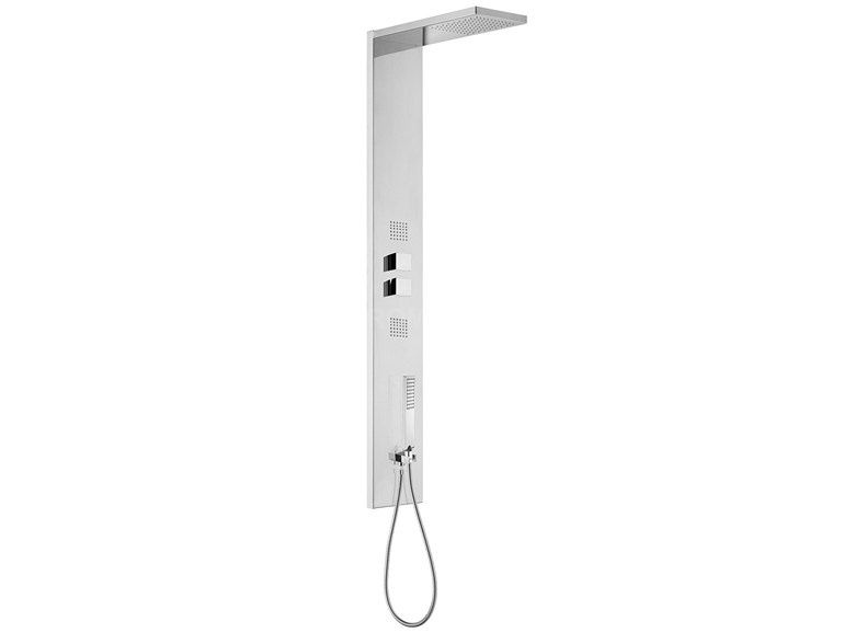 Душевая панель Bossini Manhattan-4 L00891.030. В комплекте: однорычажный смеситель, верхний душ Manhattan 240х200 мм, силиконовые дюзы EasyClean для легкой очистки, ручка-переключатель, однорежимный ручной душ Flat-One, шланг из латуни двойного фальцевания 1250 мм, держатель ручного душа, массажные форсунки.