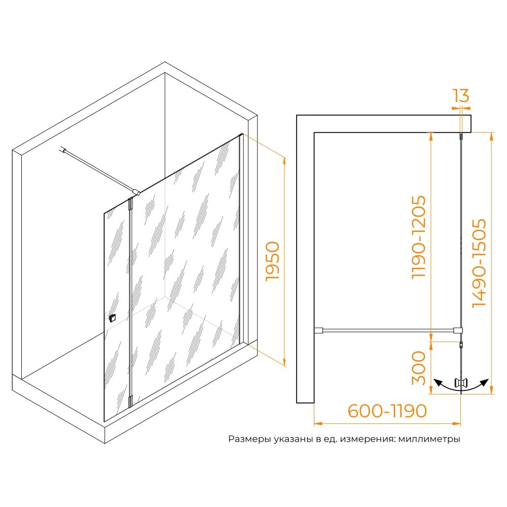 Душевая перегородка состоит из стационарного полотна и полотна с поворотной маятниковой частью - 300 мм. Стационарное стекольное полотно крепится к стене алюминиевым профилем с декоративной заглушкой. Подвижное полотно закреплено стальной маятниковой петлей с ходом 180 градусов.