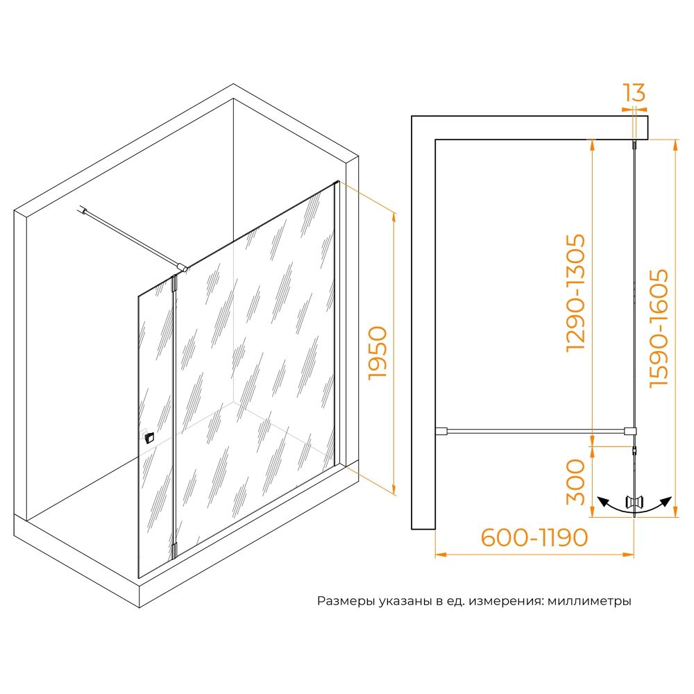 Душевая перегородка состоит из стационарного полотна и полотна с поворотной маятниковой частью - 300 мм. Стационарное стекольное полотно крепится к стене алюминиевым профилем с декоративной заглушкой. Подвижное полотно закреплено стальной маятниковой петлей с ходом 180 градусов.