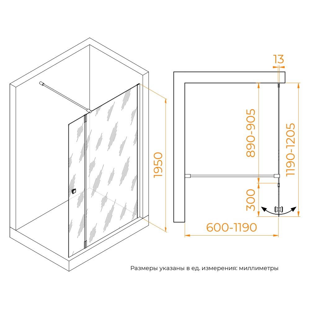 Душевая перегородка состоит из стационарного полотна и полотна с поворотной маятниковой частью - 300 мм. Стационарное стекольное полотно крепится к стене алюминиевым профилем с декоративной заглушкой. Подвижное полотно закреплено стальной маятниковой петлей с ходом 180 градусов.
