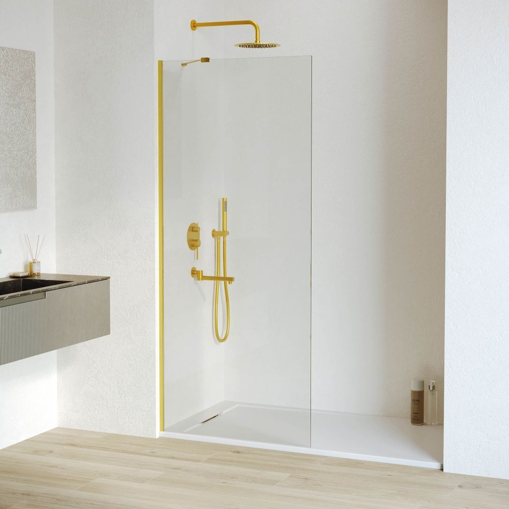 Толщина стекла данной перегородки составляет 8 мм, что делает ее очень прочной и надежной в использовании. Прозрачное стекло позволяет сохранить свет и пространство в ванной комнате, а цвет профиля золото браш придает ей элегантный и современный вид.