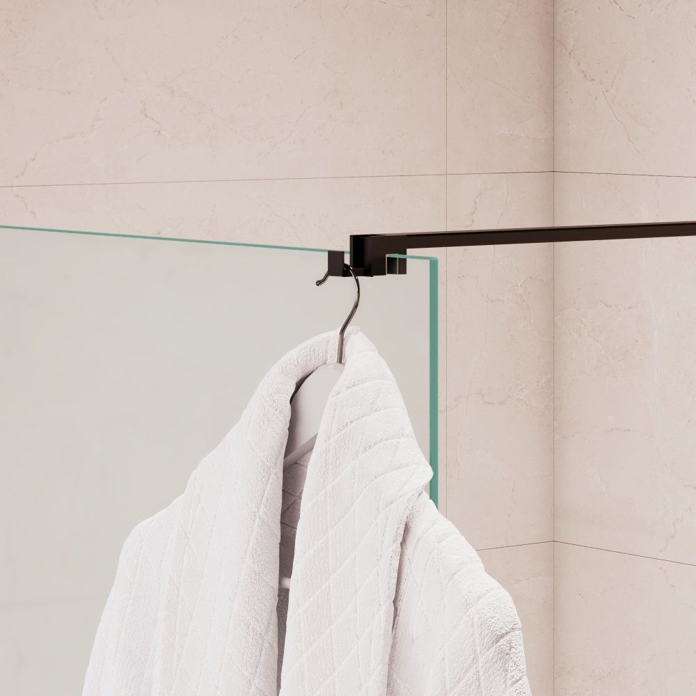 Душевая перегородка из стекла на профиле к стене бескаркасного типа с открытым входом в душ RGW WA-210 и вешалкой крючкообразного типа — Это современное решение в душе, позволяющее эффективно использовать штангу-держатель стекла как вешалку для полотенца или халата, при этом оно не только эффективно зонирует пространство, защищая остальную часть санузла от брызг, но и визуально расширяет вашу ванную комнату, наполняя ее светом и простором.