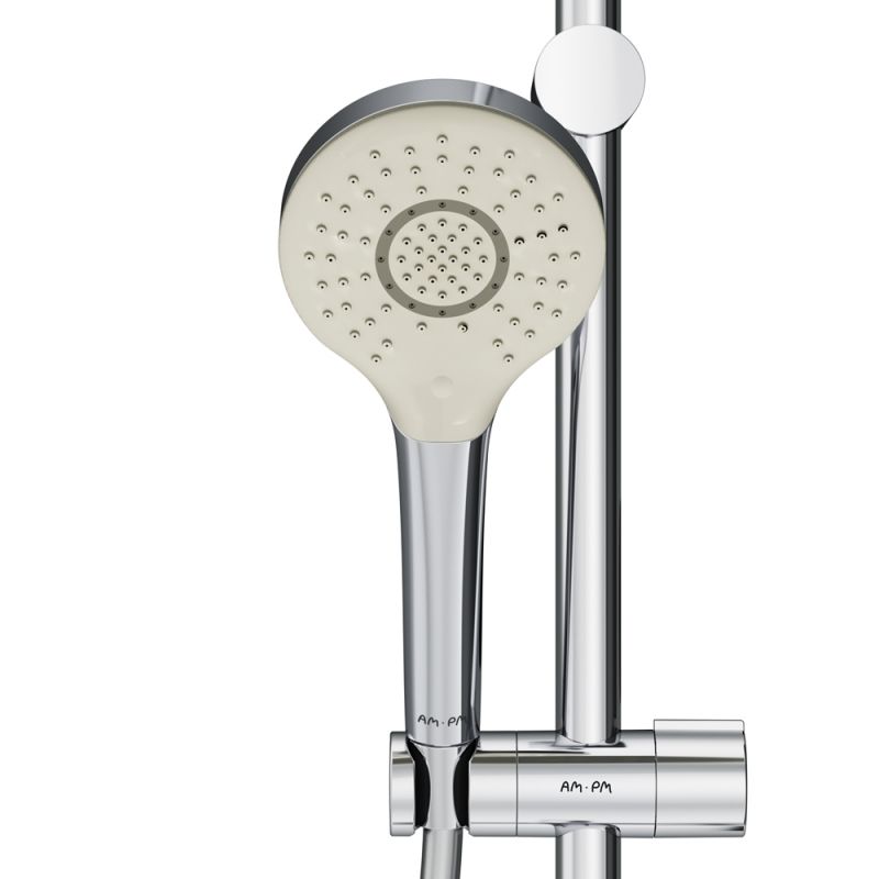 Душевая система AM.PM Chic 2.0 F0782A500 с круглым верхним душем. Смеситель для ванны и душа с термостатом: термостатический картридж с высокочувствительным термоэлементом, стопором безопасности на 38 градусов, быстрой реакцией на изменения температуры или давления надежно защищает от ожога даже при внезапном отключении холодной воды.