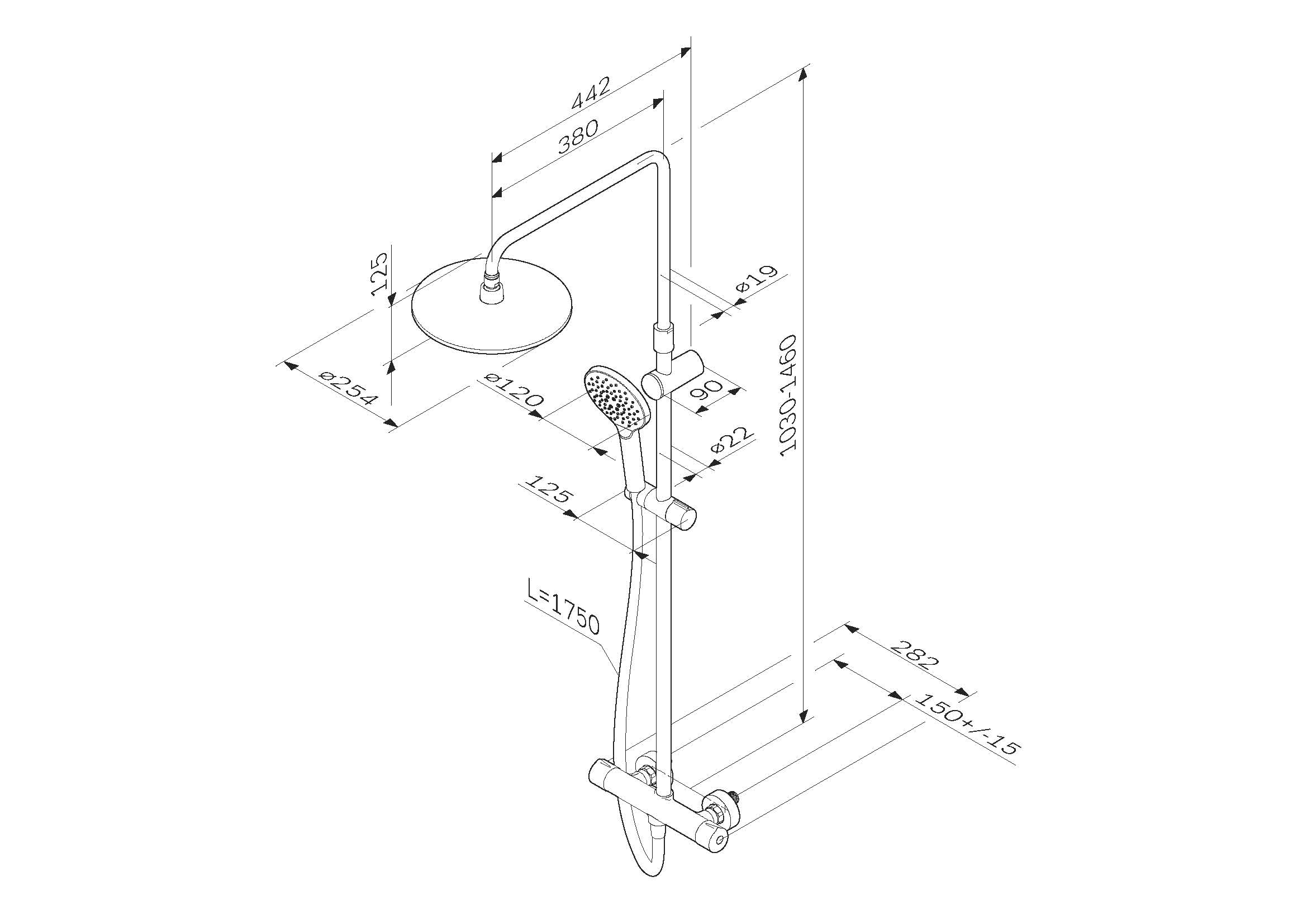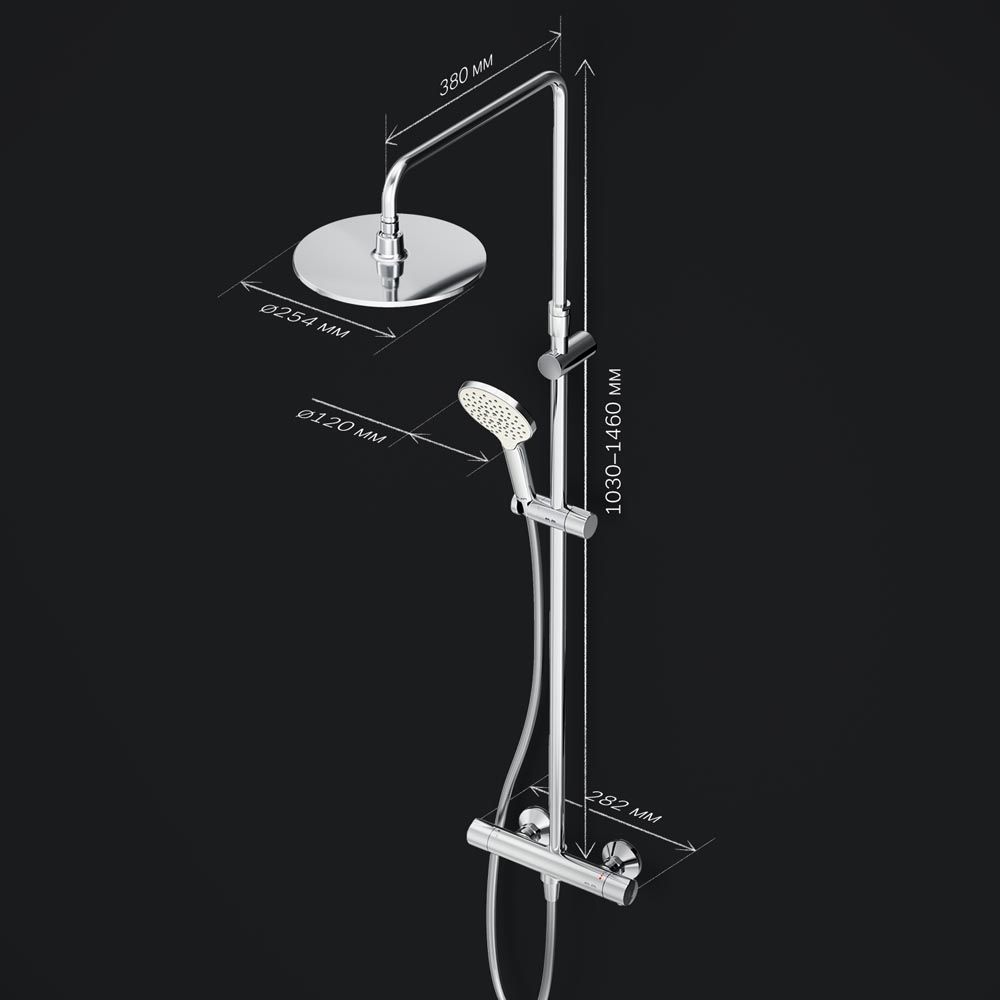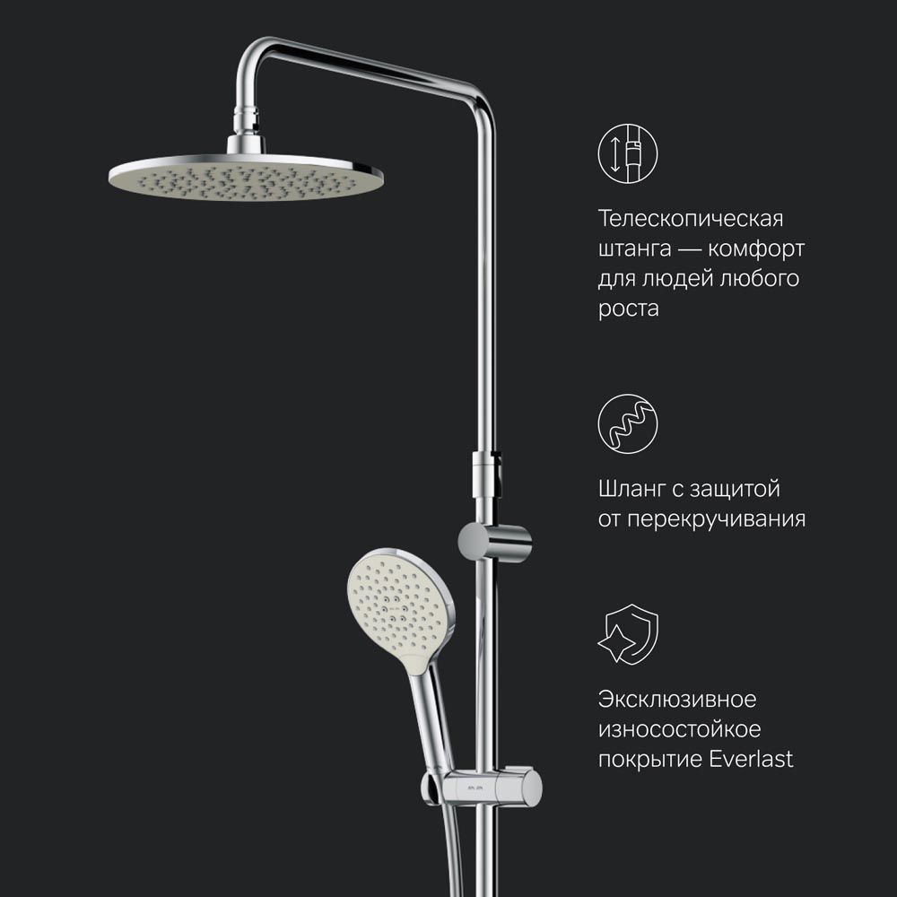 Продуманные детали для удобства использования: штанга регулируется по высоте в диапазоне от 1030 до 1460 мм обеспечивая комфорт для людей любого роста шаровый шарнир в держателе верхнего душа позволяет регулировать угол его наклона душевой шланг 1750 мм верхний душ диаметром 250 мм ручной душ диаметром 120 мм.