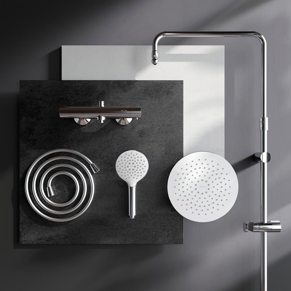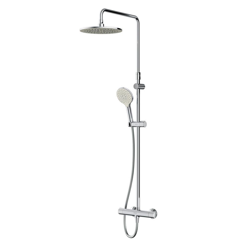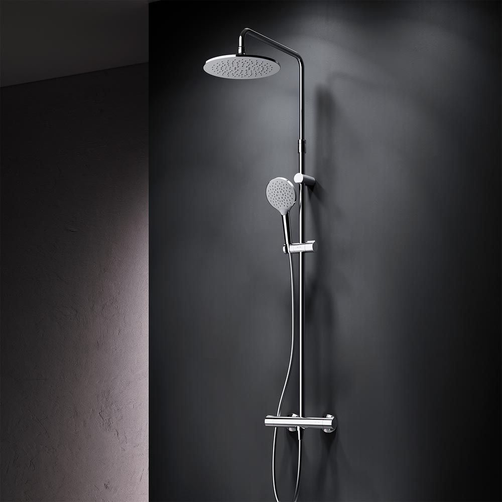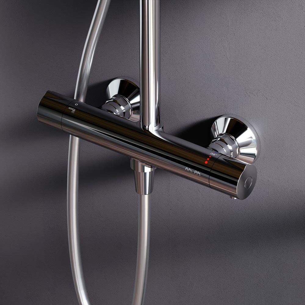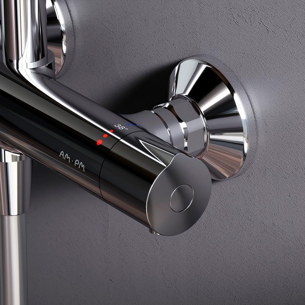 Душевая система AM PM Like F0780464 с круглым верхним душем. Тотальный дизайн в действии: все детали душевой системы – от пропорций ручного и верхнего душей до рисунка расположения форсунок на лейках – подчинены единой концепции в ультрамодном стиле Dynamic Organic. Продуманные детали для удобства использования: штанга регулируется по высоте в диапазоне от 1030 до 1460 мм, обеспечивая комфорт для людей любого роста, шаровый шарнир в держателе верхнего душа позволяет регулировать угол его наклона, душевой шланг 1750 мм, верхний душ диаметром 254 мм, ручной душ диаметром 120 мм. Интенсивный напор даже при низком давлении в системе: инновационная функция AIR IN увеличивает напор вдвое, при этом сокращая расход воды на 30 процентов. Результат – экономия средств, забота об экологии, а главное – непередаваемое удовольствие от принятия душа. Смеситель для ванны и душа с термостатом: термостатический картридж с высокочувствительным термоэлементом, стопором безопасности на 38 градусов, быстрой реакцией на изменения температуры или давления надежно защищает от ожога даже при внезапном отключении холодной воды.